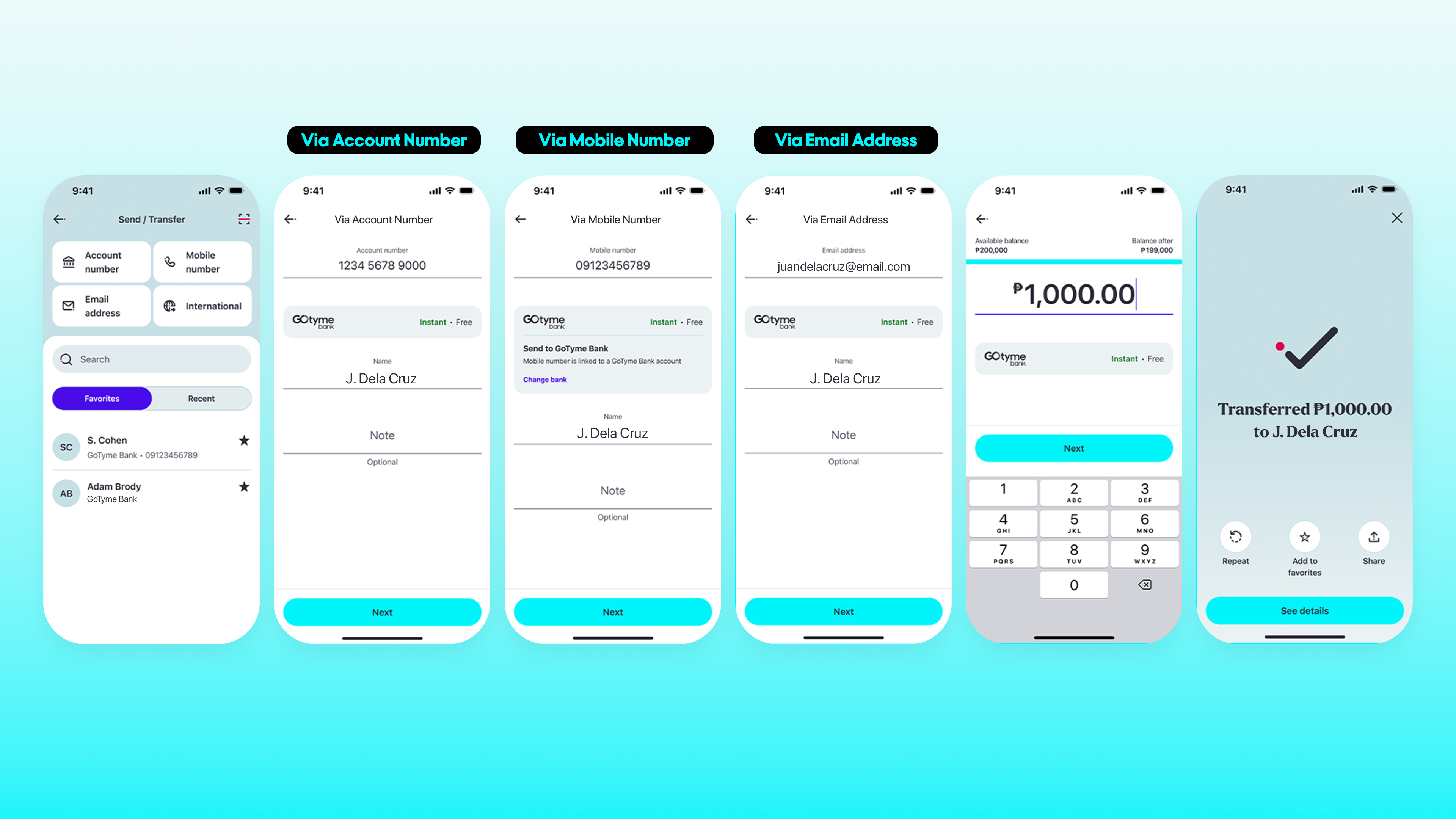 When you send money online to another GoTyme Bank account, it is always free, real-time, and comes with no transfer limits. You can send via Account Number, Mobile Number, or Email Address: